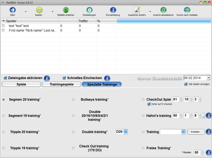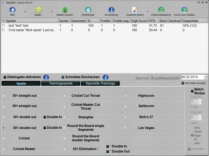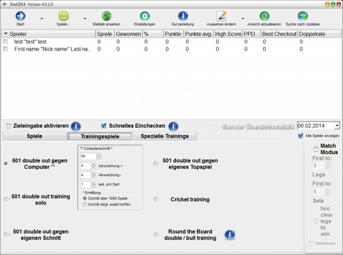 Dart 2014 (Nachfolger von Dart2010) ist ein einfach zu bedienendes Scoring- und Trainingsprogramm. Es bietet verschiedene Spielvarianten von 301/501, Cricket, Shanghai, Round the Board etc., Trainingspiele, Spielen gegen den Computer sowie spezielle Trainingsabläufe die auch völlig frei selbst zusammengestellt werden können. Neben einfachen und detaillierten Statistiken (inklusive Doppelquote) gibt es auch optische Auswertungen des Trefferbildes. Wenn man möchte kann man nicht nur angeben wo der Dart gelandet ist, sondern auch wo er hätte landen sollen ;-). Dadurch werden Auswertungen möglich, die sehr genau erkennen lassen in welchen Bereichen noch Trainingsbedarf herrscht.