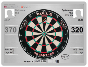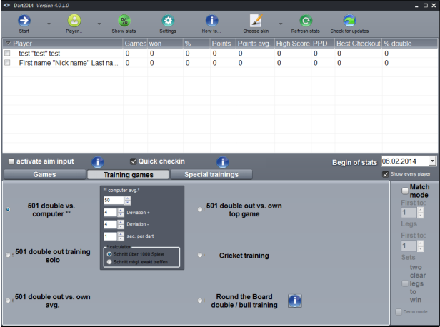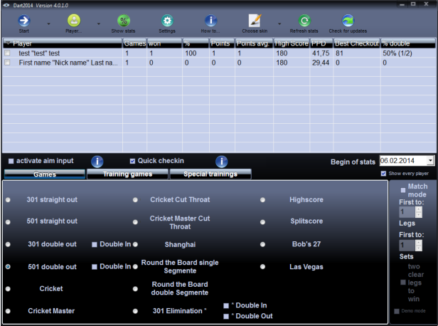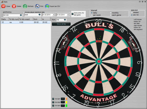 Dart2014 (successor of Dart2010) is an easy to use score and training program. It includes several kind of games like 301/501, Cricket, Shanghai, Round the Board etc., training games, play against the computer, you can even create your own trainings. There a simple and detailed statistics of course including percentage on the doubles and a visual display of you hits. If you like you can not only mark your hits but also your aims ;-). This allows detailed statistics that shows you where you can improve your game.